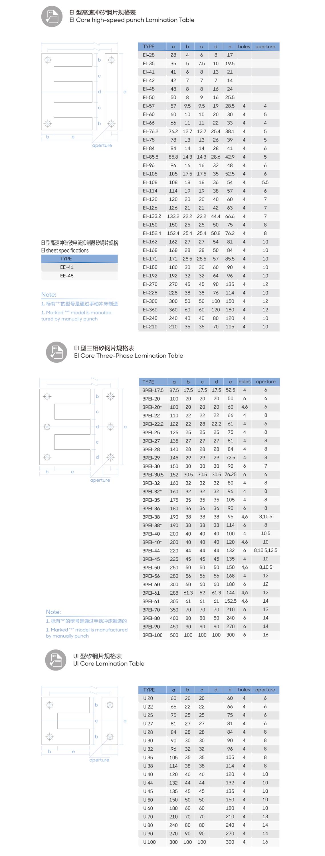 M3, M4, M5, M6 (CRGO) 35W250, 35W300, 35W400 (0.35MM) 50W250, 50W310, 50W400, 50W470, 50W600, 50W800 (0.5MM) |